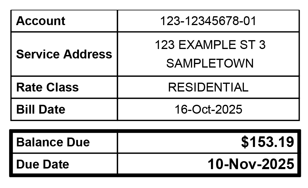 Here, you’ll find your Account Number, Service Address, Bill Date, Balance Due, and Due Date all in one place.